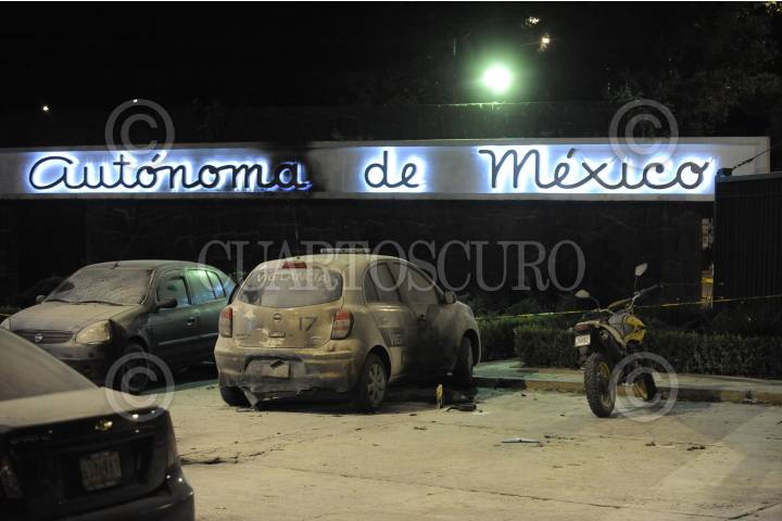 MÉXICO, D.F., 30SEPTIEMBRE2014.- En la puerta principal de Ciudad Universitaria, ubicada sobre el Eje 10, un auto de vigilancia de CU, un auto particular y una moto, se quemaron al parecer por una bomba molotov, también se encontraron cartuchos percutidos. FOTO: LUIS CARBAYO /CUARTOSCURO.COM