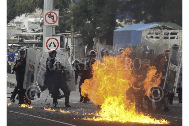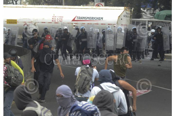 MÉXICO, D.F., 20NOVIEMBRE2014.- Se dió un enfrentamiento entre Policías y jóvenes embozados cuando éstos últimos intentaron realizaron bloqueos a los accesos del Aeropuerto Internacional de la Ciudad de México, los inconforme les aventaron piedras y bombas molotov a los granaderos quienes respondieron la agresión, una patrulla de la PGJDF resultó vandalizada y los granaderos detuvieron a varios manifestantes. FOTO: ARMAN MONROY /CUARTOSCURO.COM