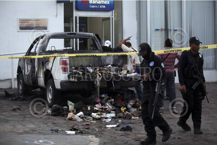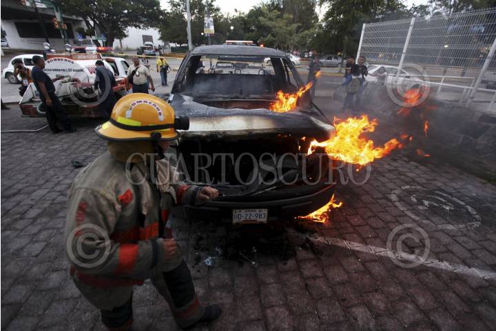 CHILPANCINGO, GUERRERO.- Una camioneta de doble cabina, cargada con presuntas bombas molotov, fue incendiada por sujetos desconocidos en el estacionamiento de un banco colindante al Instituto Electoral de Participación Ciudadana (IEPC) en Chilpancingo, Guerrero. FOTO: FÉLIX MÁRQUEZ /CUARTOSCURO.COM