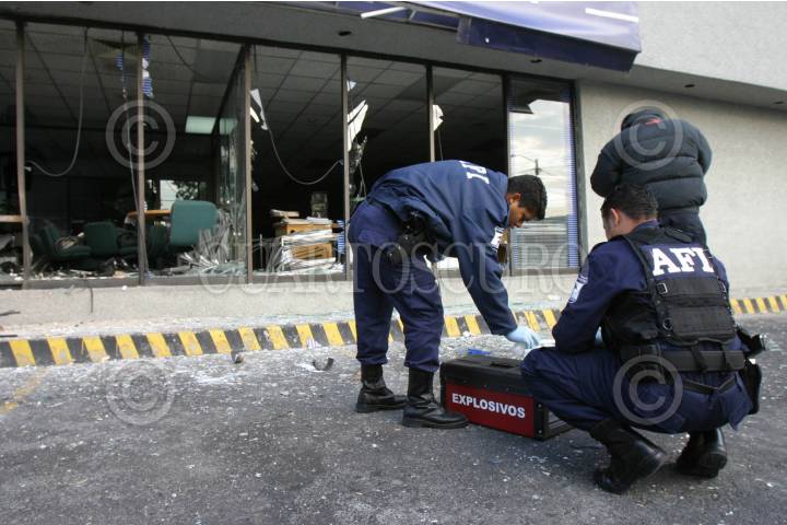 ATIZAPAN, ESTADO DE MEXICO 18NOVIEMBRE2005.- El Comando Revolucionario del Trabajo "México Bárbaro", emitió un comunicado en el que se atribuye la autoría del estallido de artefactos explosivos en sucursales bancarias del estado de México. El grupo se pronuncia contra el neobileralismo. También hacen referencia al acuerdo del Área de Libre Comercio para las Américas (ALCA), y cuestionan el papel del presidente Vicente Fox, adoptando la frase del presidente venezolano Hugo Chávez, calificándolo como "cachorro del Imperio". Aseguran que sus acciones buscan "respaldar y fortalecer la lucha que nuestros hermanos obreros y campesinos impulsan y desarrollan frente al capital". Personal de la AFI realiza investigaciones en el lugar de los hechos. FOTO: Pedro Marrufo/CUARTOSCURO.COM