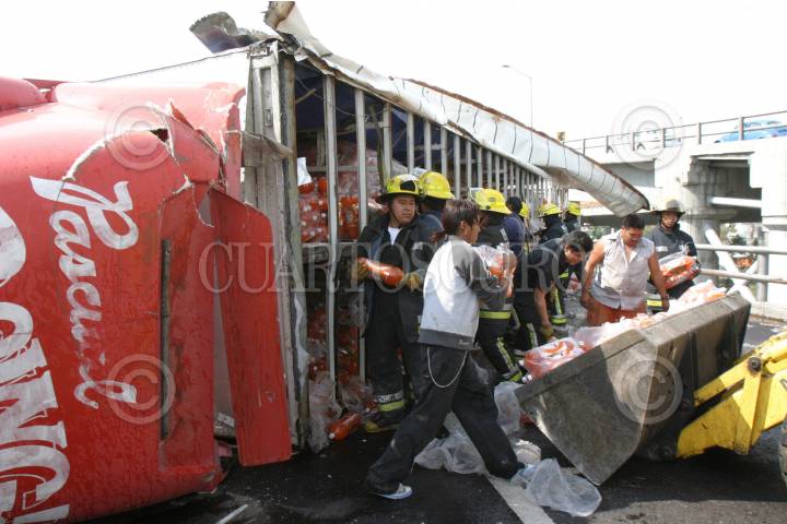 MÉXICO, D.F; 02 DE ENERO 2007.- Los bomberos ayudaron a recolectar los productos después de que se volcara el trailer donde se transportaba. FOTO:PEDRO MARRUFO/CUARTOSCURO.COM
