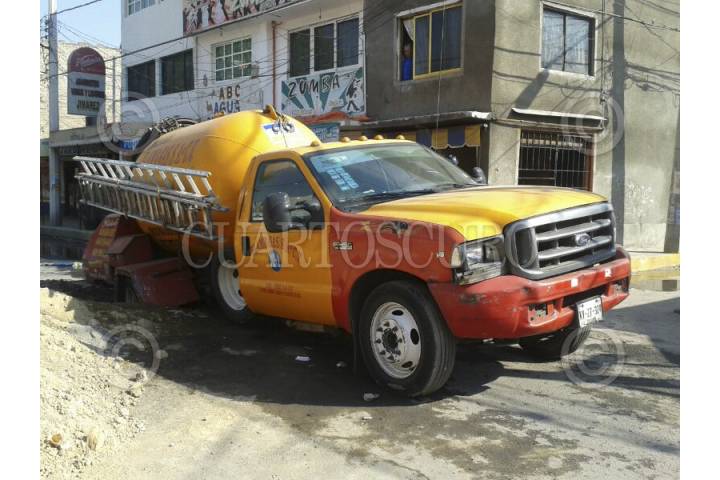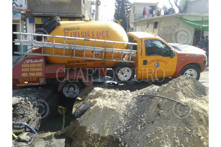 MÉXICO, D.F., 12ENERO2014.- Una camioneta de gas LP de la empresa Flama Gas cayo a un boquete que se encontraba sin señalización en el cruce de las calles Santa Maria y San José en el pueblo de Magdalena Atlozalpa en la delegación Iztapalapa. FOTO: SAÚL LÓPEZ /CUARTOSCURO.COM