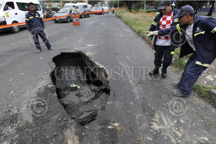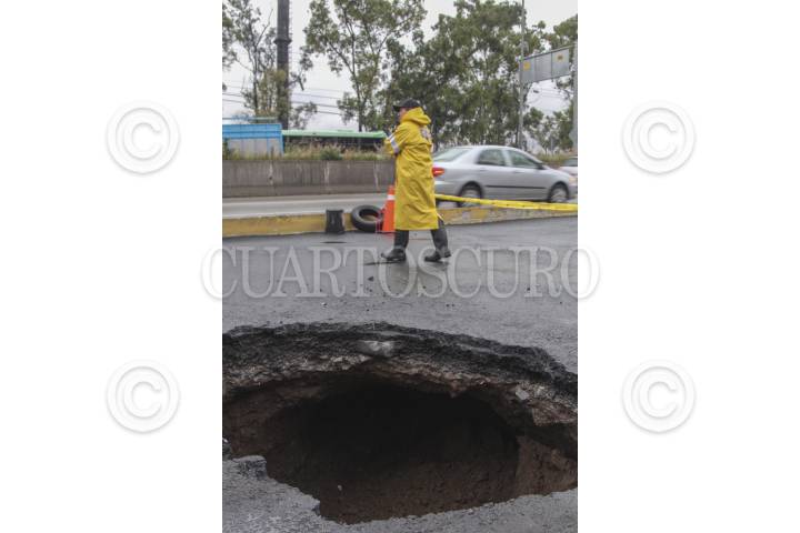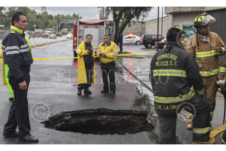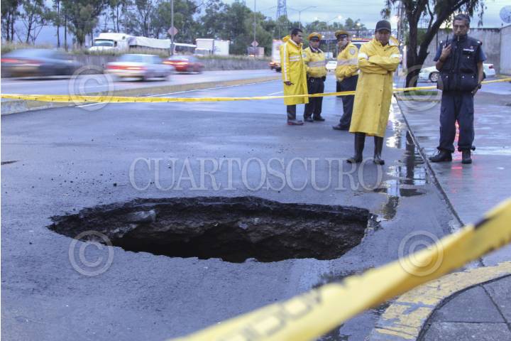 MÉXICO, D.F., 09SEPTIEMBRE2014.- Bomberos de la Ciudad de México y personal de Protección Civil acordonaron un boquete que se abrió sobre la carretera federal México-Toluca a la altura del kilómetro 14 en la delegación Cuajimalapa. FOTO: SAÚL LÓPEZ /CUARTOSCURO.COM