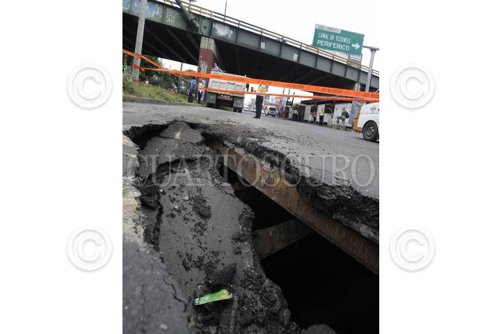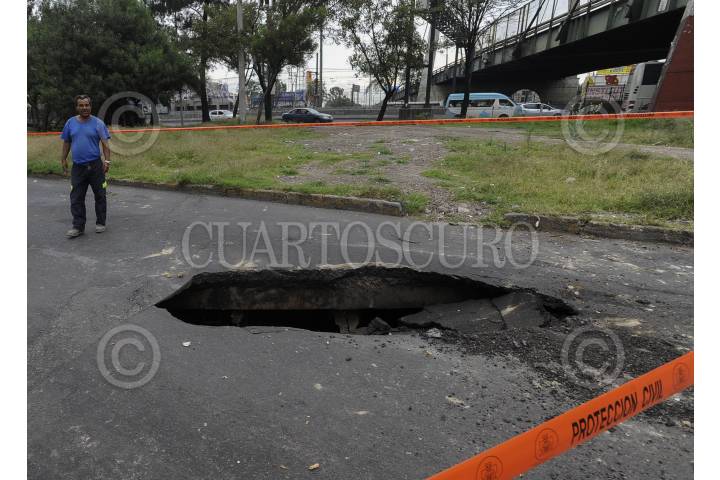 MÉXICO, D.F., 06OCTUBRE2014.- Personal de Protección Civil de Distrito Federal cerraron los carriles laterales de la Calzada Ignacio Zaragoza tras realizarse un socavón de más de 12 metros de profundidad. Dicho boquete se realizó cuando un trailer circulaba por la calzada Zaragoza y quedo atrapado casi al cruce con la avenida Canal de San Juan. FOTO: ARMANDO MONROY /CUARTOSCURO.COM