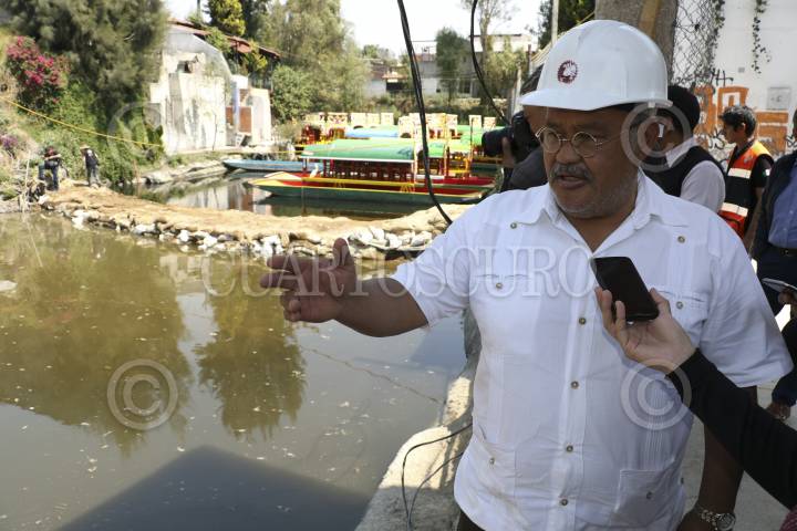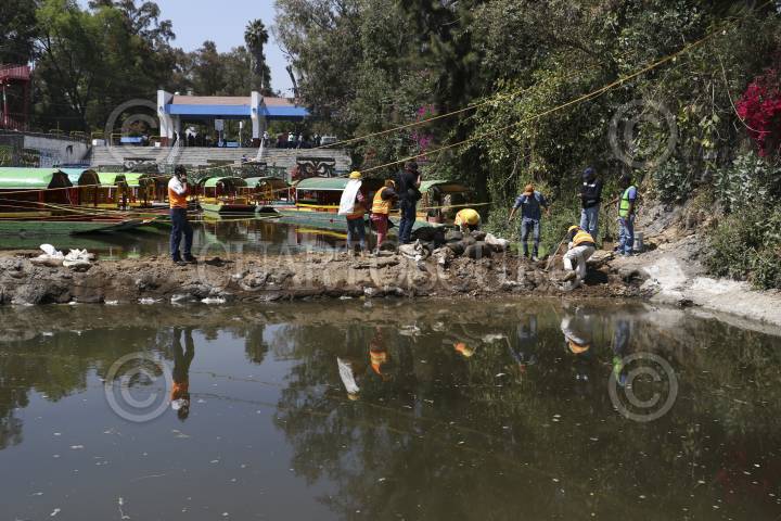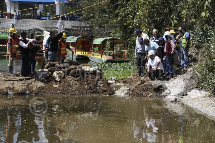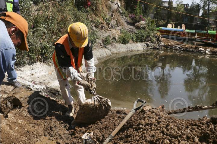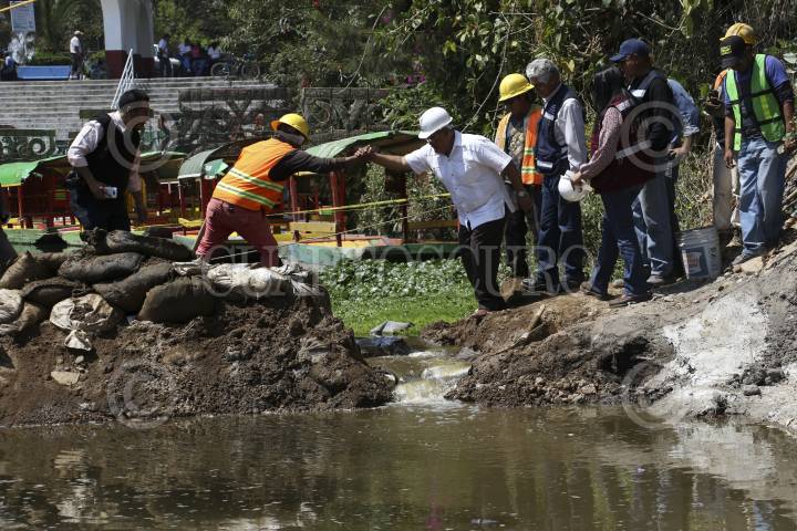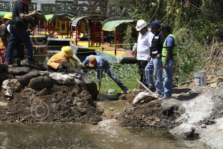 CIUDAD DE MÉXICO, 27FEBRERO.- Trabajadores de la delegación Xochimilco y Sacmex comenzaron a retirar costales despúes de haber reparado un boquete que se produjo en el embarcadero Zacapa, el delegado Avelino Mendez Rangel, supervisó los trabajos en el embarcadero. FOTO: SAÚL LÓPEZ /CUARTOSCURO.COM
