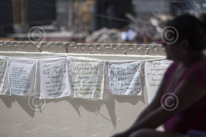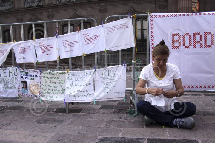 MONTERREY, NUEVO LEÓN, 03AGOSTO2016.- Integrantes de Fuerzas Unidas por Nuestros Desaparecidos en Nuevo León A.C., (FUNDENL) bordaron los nombres de sus familiares desaparecidos afuera de la Procuraduría General de Justicia de Nuevo León. Esto a manera de protesta para exigir que las autoridades den seguimiento a los casos de personas desaparecidas. FOTO: MANUELA GARCIA /CUARTOSCURO.COM