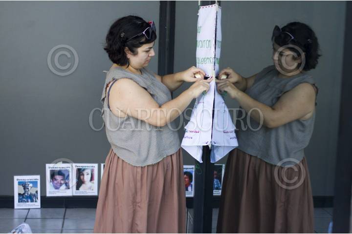MONTERREY, NUEVO LEÓN, 03AGOSTO2016.- Integrantes de Fuerzas Unidas por Nuestros Desaparecidos en Nuevo León A.C., (FUNDENL) bordaron los nombres de sus familiares desaparecidos afuera de la Procuraduría General de Justicia de Nuevo León. Esto a manera de protesta para exigir que las autoridades den seguimiento a los casos de personas desaparecidas. FOTO: MANUELA GARCIA / CUARTOSCURO.COM