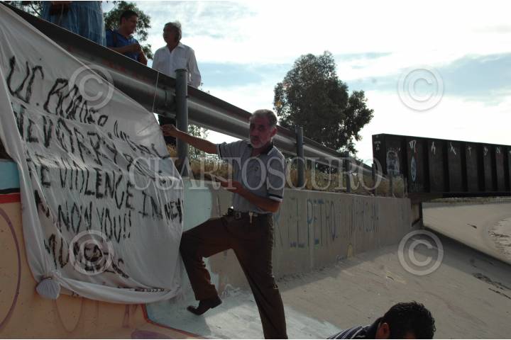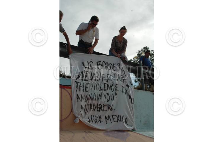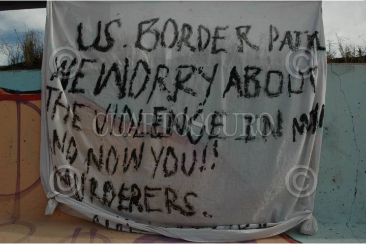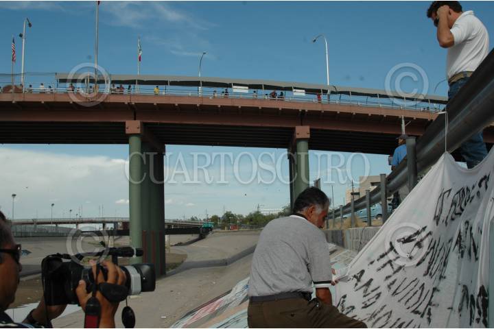 CIUDAD JUÁREZ, CHIHUAHUA, 08JUNIO2010.- Luego del homicidio que se registrara el día de ayer, donde un menor de edad fue victimado, presuntamente por la patrulla fronteriza, esta tarde fue colocada una manta de manera de protesta en el Puente Negro. Cabe destacar que autoridades mexicanas ya han pedido se investigue el caso para que se esclarezca este hecho, donde según informes, un grupo de jóvenes se acercaron al lugar y lanzaron piedras a los agentes norteamericanos, por lo que éstos respondieron con disparos. Este hecho aún continúa en investigación y autoridades de Estados Unidos, por el momento no han brindado algún tipo de infromación. FOTO: IGNACIO RUIZ/CUARTOSCURO.COM