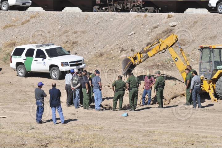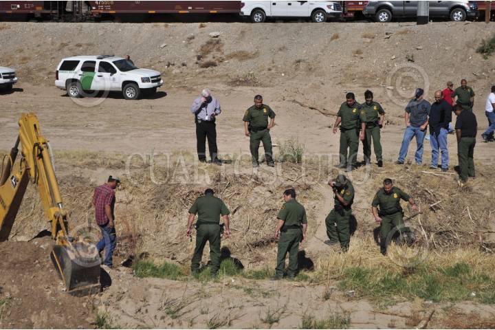 CIUDAD JUÁREZ, CHIHUAHUA, 28OCTUBRE2011.- Luego de que una máquina de carga pesada pasara por el bordo del Río Bravo del lado americano, misma que se hundió sobre el camino, un túnel fue descubierto, sin que hasta el momento se conozca su uso. Decenas de agentes de la Patrulla Fronteriza se congregaron en el bordo del río a la altura del segundo barrio, mientras que del lado mexicano se ubica por la preparatoria Altavista, para desalojar la zona del descubrimiento y establecer de qué se trata. Hasta el momento las autoridades del lado americano no han establecido el uso que este subterráneo pudiera tener, o con qué fin fue escarbado. FOTO: NACHO RUÍZ/CUARTOSCURO.COM