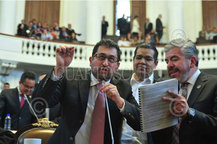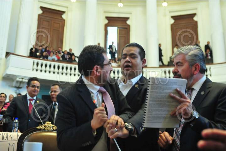 CIUDAD DE MÉXICO, 07NOVIEMBRE2017.- El coordinador de Morena, César Cravioto, discute con los perredista Raúl Flores e Iván Texta Solís, cuando tocaron el tema de la construcción de una planta termovalorizadora en el Bordo Poniente. Los morenistas acusaron a Miguel Ángel de Mancera de ser su negocio, y lo cuestionaron de no tener dinero para la reconstrucción de la ciudad tras los sismos de septiembre, perso si para un negocio de 100 mil millones de pesos. FOTO: CUARTOSCURO.COM