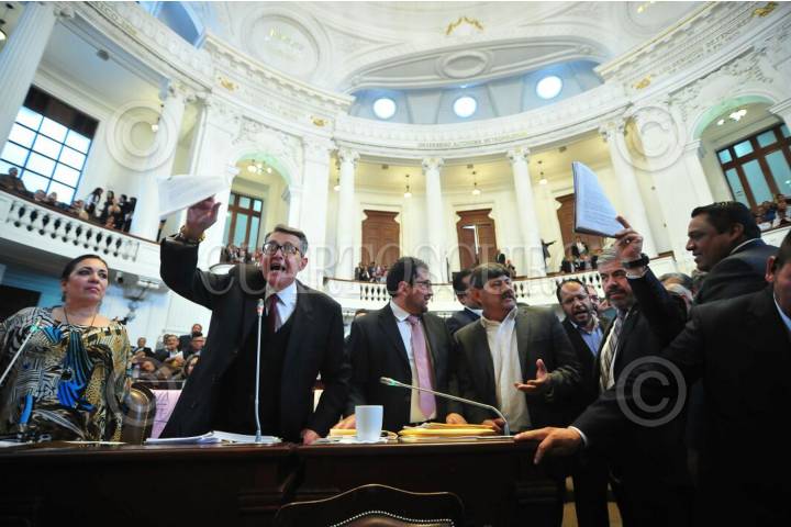 CIUDAD DE MÉXICO, 07NOVIEMBRE2017.- Los diputados de Morena tomaron la tribuna de la Asamblea Legislativa del Distrito Federal cuando se tocó el tema de la construcción de una planta termovalorizadora en el Bordo Poniente, en donde los morenistas acusaron a Miguel Ángel Mancera de ser su negocio, cuestionaron al Jefe de Gobierno de no tener dinero para la reconstrucción de la ciudad tras los sismos de septiembre, perso si para un negocio de 100 mil millones de pesos. En la imagen el diputado perredista Manuel Granados reclama la toma de la tribuna. FOTO: JAVIER ARTURO JIMÉNEZ/CUARTOSCURO.COM