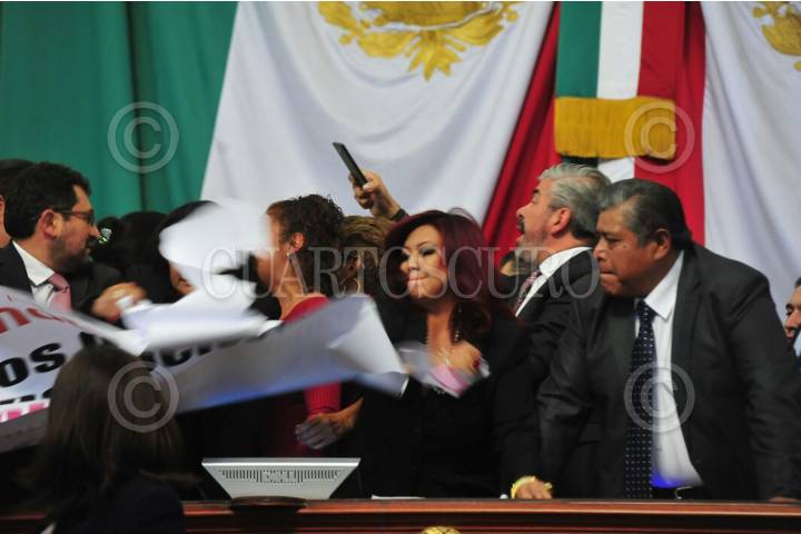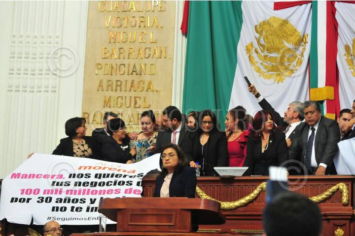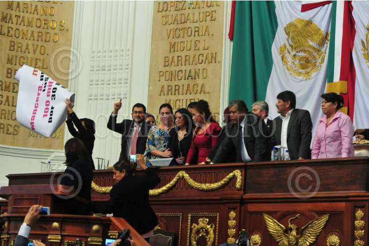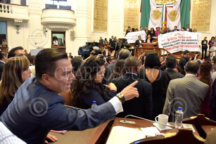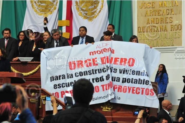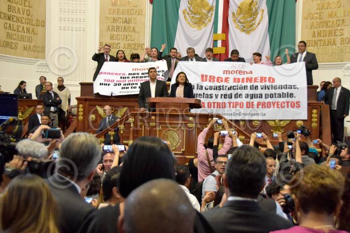 CIUDAD DE MÉXICO, 07NOVIEMBRE2017.- Los diputados de Morena tomaron la tribuna de la Asamblea Legislativa del Distrito Federal cuando se tocó el tema de la construcción de una planta termovalorizadora en el Bordo Poniente, en donde los morenistas acusaron a Miguel Ángel Mancera de ser su negocio, cuestionaron al Jefe de Gobierno de no tener dinero para la reconstrucción de la ciudad tras los sismos de septiembre, perso si para un negocio de 100 mil millones de pesos. FOTO: JAVIER ARTURO JIMÉNEZ/CUARTOSCURO.COM