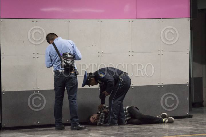 CIUDAD DE MÉXICO, 30ABRIL2017.- Un oficial de polícia y un trabajador del Transporte Colectivo Metro, intentan despertar a un individuo que se quedó dormido en estado de ebriedad en la estación Isabel la Católica. FOTO: TERCERO DÍAZ /CUARTOSCURO.COM