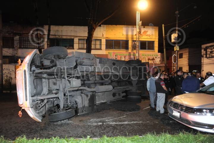 CIUDAD DE MÉXICO., 28JULIO2018.- Un camión de carga tipo torton, volcó al ser impactado por un auto Renault, cuando este huía por haber golpeado a varios autos antes y una ambulancia, sobre Cuitláhuac a la altura de Mar Mediterráneo en la colonia Popotla. El conductor ebrio, fue detenido. FOTO: LUIS CARBAYO /CUARTOSCURO.COM