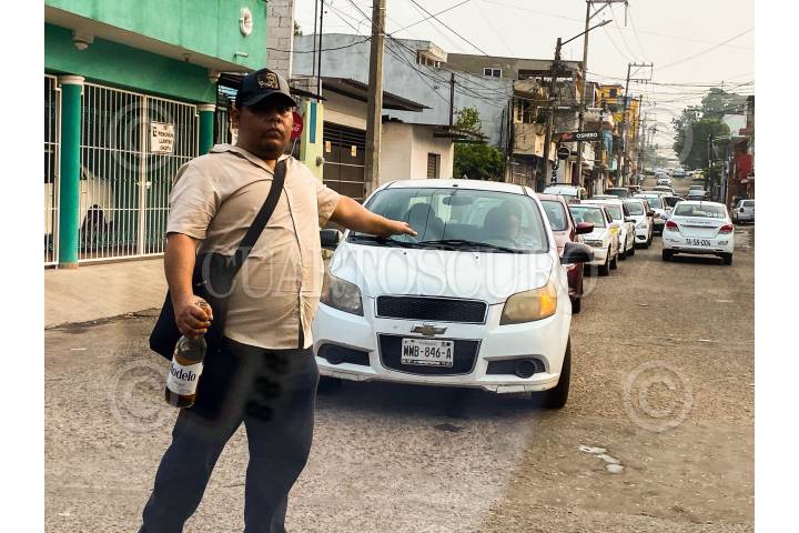 VILLAHERMOSA, TABASCO. 10 JUNIO2024.- Con caguama en mano un hombre dirige el tráfico en Carlos Green, una avenida congestionada por falta de elementos de tránsito. FOTO: LUIS LÓPEZ/CUARTOSCURO.COM