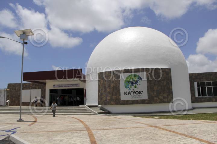 CANCÚN, QUINTANA ROO,19JULIO2013.-El Planetario de Cancún "Ka'Yok", el primero con tecnología de quinta generación que surge en México y el décimo en su tipo, en el mundo, fue inaugurado esta mañana por el gobernador de Quintana Roo, Roberto Borge Angulo. Para la construcción de la obra, el gobierno municipal de Benito Juárez donó un terreno de cinco hectáreas al Consejo Quintanarroense de la Ciencia y Tecnología (Coqcyt) y se invirtieron 39 millones 480 mil pesos, aportados por el Consejo Nacional de Ciencia y Tecnología (Conacyt). Cuenta con un Planetario, un Observatorio astronómico, el Museo del Agua, un Parque de Ecotecnias y un Jardín botánico, sobre una superficie de 10 mil 400 metros cuadrados. FOTO: ELIZABETH RUÌZ / CUARTOSCURO.COM