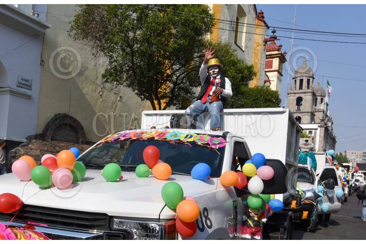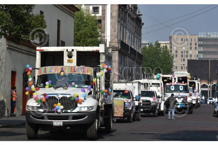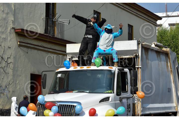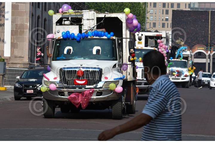 Recolectores de basura de Toluca realizaron una caravana con sus unidades adornadas y botargas en la capital mexiquense para desearles un feliz Día del Niño a los pequeños de la ciudad.
