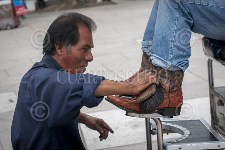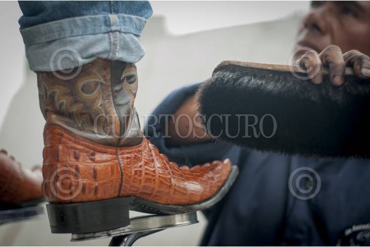 MÉXICO, D.F., 11JUNIO2013.- Un bolero lustra las botas vaqueras de un señor que espera una cita en la Glorieta de los Insurgentes. Estos trabajadores ganan entre 15 y 20 pesos por cada cliente. FOTO: DIEGO SIMÓN SÁNCHEZ /CUARTOSCURO.COM