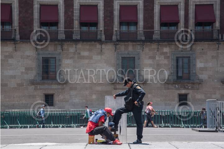 CIUDAD DE MÉXICO, 23JUNIO2017.- Un policía limpia sus botas en su puesto de vigilancia, frente a Palacio Nacional. FOTO: TERCERO DÍAZ /CUARTOSCURO.COM