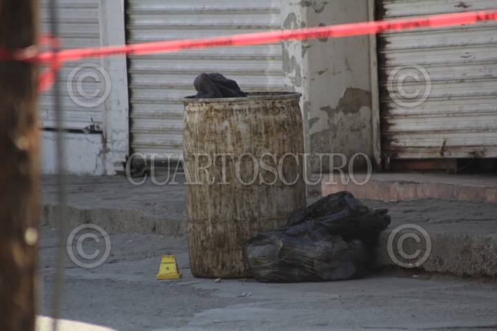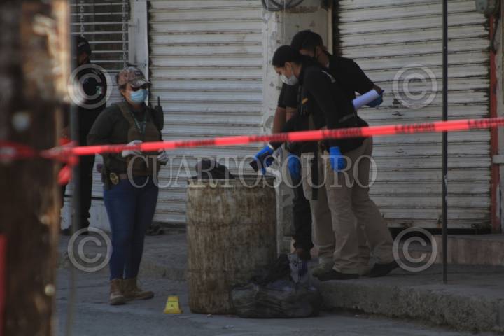 Elementos de la policía acudieron a la zona centro de Ciudad Juárez tras el hallazgo de un cadáver en un bote de basura.