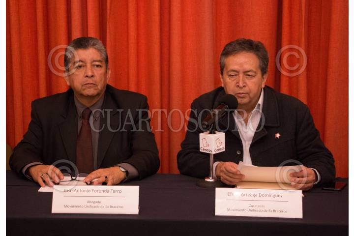 CIUDAD DE MÉXICO, 08FEBRERO2019.- José Antonio Foronda Farro, abogado de este movimiento y Efraín Arteaga Dominguez, representante del Movimiento Unificado de Ex Braceros, informaron mediante una conferencia de prensa que luego de que la Comisión Interamericana de Derechos Humano (CIDH), aprobara la queja del adeudo histórico para este movimiento de Ex Braceros en el periodo 1942- 1967, estos buscarán una pronta mesa de diálogo con el actual gobierno encabezado por el presidente Andrés Manuel López Obrador. FOTO: ROGELIO MORALES /CUARTOSCURO.COM