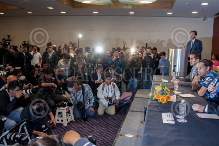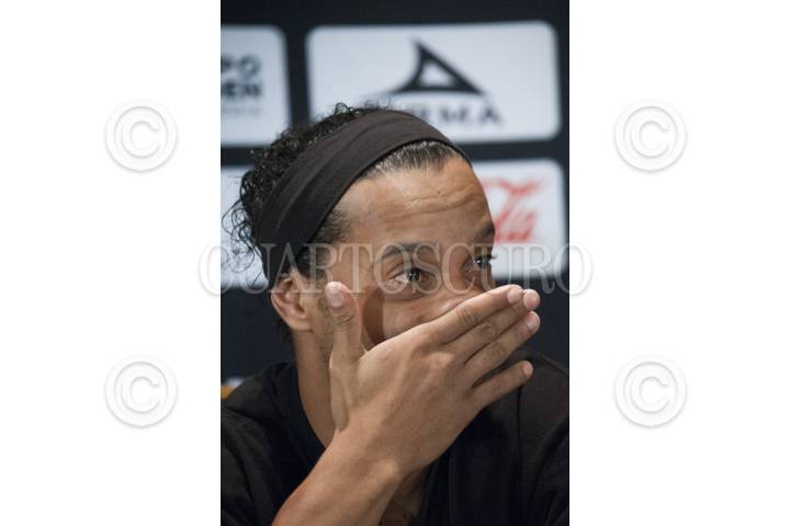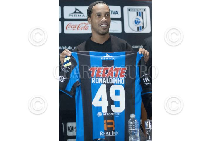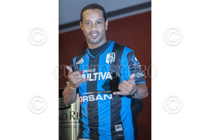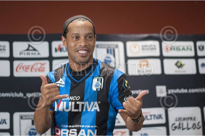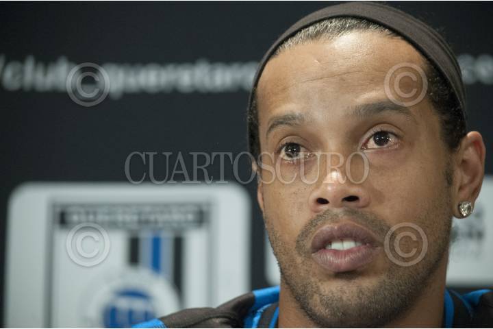 MÉXICO, D.F., 12SEPTIEMBRE2014.- Ronaldo de Assis Moreira, conocido como Ronaldinho, fue oficialmente presentado en la Ciudad de México con el Club Gallos Blancos del Querétaro. El astro de fútbol brasileño firmó un contrato por dos años y manifestó que conoce todo de la liga de fútbol mexicana. FOTO: DIEGO SIMÓN SÁNCHEZ /CUARTOSCURO.COM