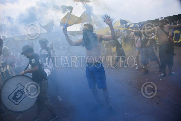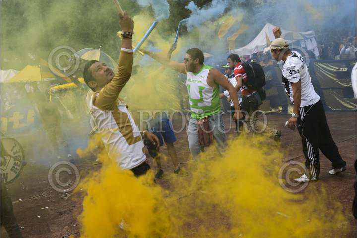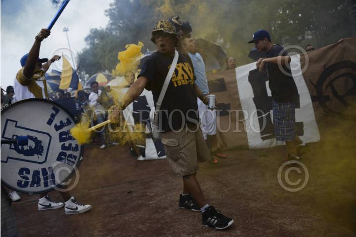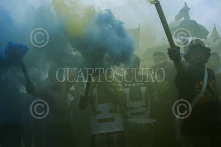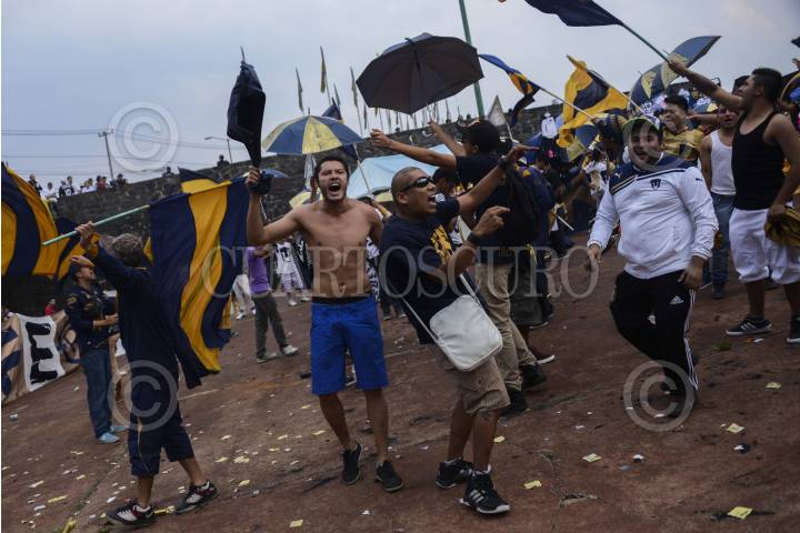 MÉXICO, D.F., 04MAYO2014.- Integrantes de la barra brava de Pumas, La Rebel, cantan porras de apoyo a su equipo minutos antes de que inicie el juego en donde los auriazules perdieron con un marcador de 4 a 2. FOTO: PEDRO ANZA /CUARTOSCURO.COM