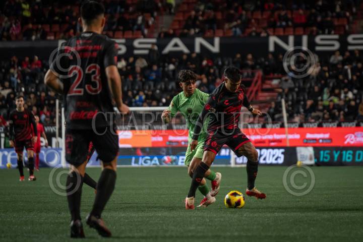 TIJUANA BAJA CALIFORNIA 14FEBRERO2025.-Efraín Álvarez de los Xolos de Tijuana y Sebastián Jurado de los Bravos de Juárez. En el partido correspondiente a la jornada 7 del Clausura 2025, disputado en el Estadio Caliente, los Xolos de Tijuana sufrieron una dolorosa derrota por 2-1 ante Bravos de Juárez, con un gol en los minutos finales que sentenció el encuentro. El equipo dirigido por Juan Carlos Osorio se adelantó rápidamente en el marcador al minuto 2, lo que hacía pensar en una noche favorable para los locales. Sin embargo, el conjunto visitante logró empatar antes de que concluyera el primer tiempo, dejando todo abierto para la segunda parte. Durante el complemento, Xolos se mostró insistente en ataque, generando constantes llegadas al área rival, pero carecieron de contundencia frente al arco. Cuando parecía que el encuentro terminaría en empate, Juárez aprovechó un descuido defensivo en el tiempo añadido y marcó el gol que les dio la victoria. Con este resultado, el equipo fronterizo se mantiene en la parte baja de la tabla, ubicándose en la posición 16. Ahora, Xolos buscará mejorar su situación en su próximo compromiso contra Puebla, donde intentarán reencontrarse con el triunfo y escalar posiciones en la clasificación. FOTO: CHRIS NOYOLA / CUARTOSCURO.COM