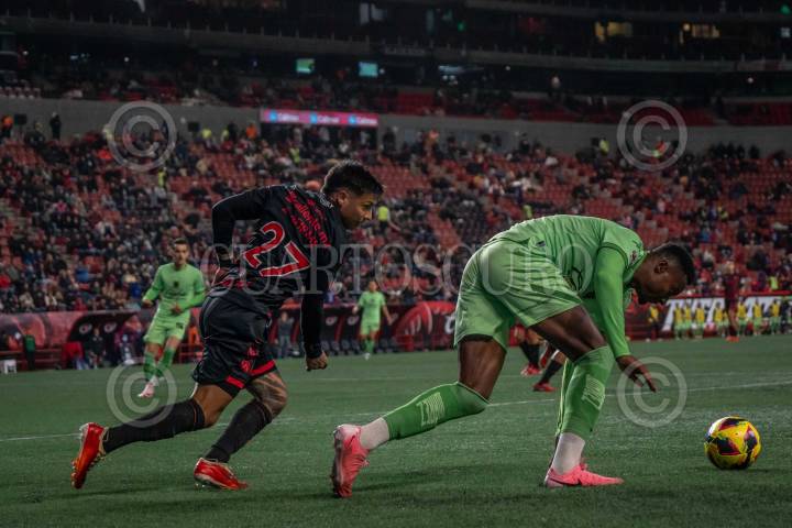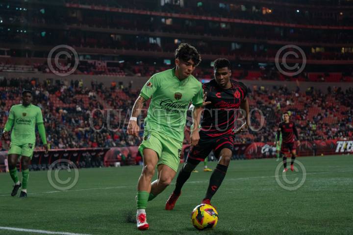 TIJUANA BAJA CALIFORNIA 14FEBRERO2025.-Denzell Garcia de Los Bravos y Domingo Blanco de los Xolos. En el partido correspondiente a la jornada 7 del Clausura 2025, disputado en el Estadio Caliente, los Xolos de Tijuana sufrieron una dolorosa derrota por 2-1 ante Bravos de Juárez, con un gol en los minutos finales que sentenció el encuentro. El equipo dirigido por Juan Carlos Osorio se adelantó rápidamente en el marcador al minuto 2, lo que hacía pensar en una noche favorable para los locales. Sin embargo, el conjunto visitante logró empatar antes de que concluyera el primer tiempo, dejando todo abierto para la segunda parte. Durante el complemento, Xolos se mostró insistente en ataque, generando constantes llegadas al área rival, pero carecieron de contundencia frente al arco. Cuando parecía que el encuentro terminaría en empate, Juárez aprovechó un descuido defensivo en el tiempo añadido y marcó el gol que les dio la victoria. Con este resultado, el equipo fronterizo se mantiene en la parte baja de la tabla, ubicándose en la posición 16. Ahora, Xolos buscará mejorar su situación en su próximo compromiso contra Puebla, donde intentarán reencontrarse con el triunfo y escalar posiciones en la clasificación. FOTO: CHRIS NOYOLA / CUARTOSCURO.COM