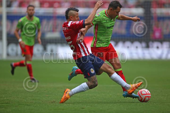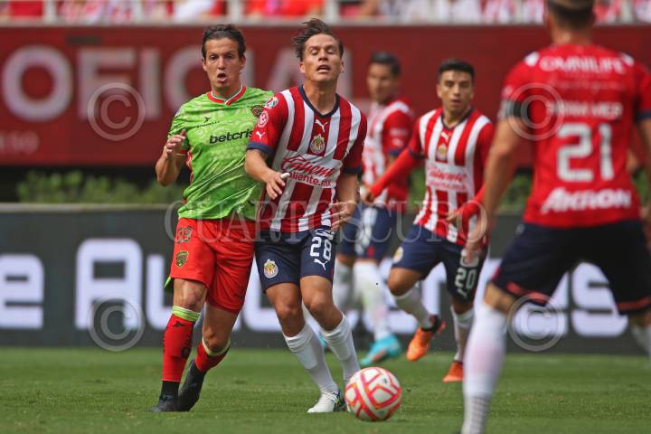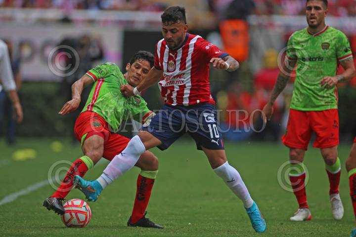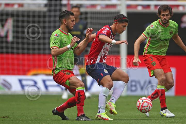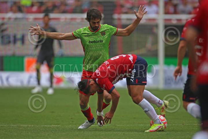 Alberto Acosta, jugador de Juárez, disputa un balón con el contrario de Chivas, Roberto Alvarado, esto en partido correspondiente a la Jornada 1 del Torneo Apertura 2022 de la Liga BBVA MX.