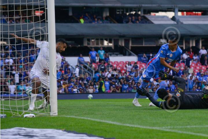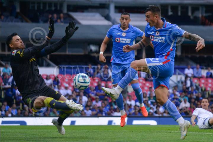 Augusto Lotti, mediocampista del Cruz Azul, remata el balón ante la salida de Alfredo Talavera, en partido correspondiente a la jornada 9 del torneo Clausura 2023 de la Liga MX.