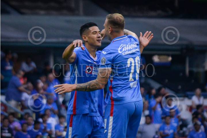 Uriel Antuna, delantero del Cruz Azul celebra su anotación junto a su compañero Carlos Rotondi, en partido correspondiente a la jornada 9 del torneo Clausura 2023 de la Liga MX frente al club Juárez.