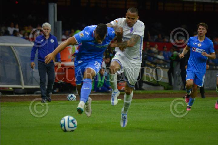 Carlos Rodríguez, mediocampista del Cruz Azul, encara ante la marca de Jesús Dueñas, defensa del club Juárez, en partido correspondiente a la jornada 9 del torneo Clausura 2023 de la Liga MX.