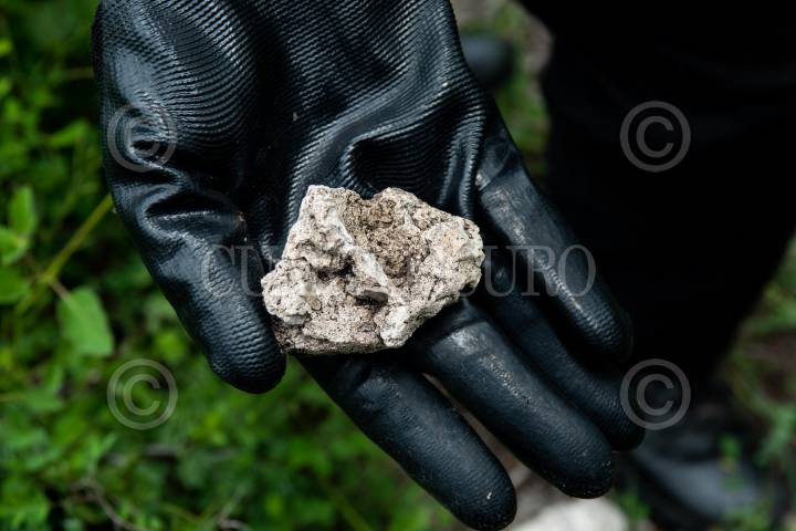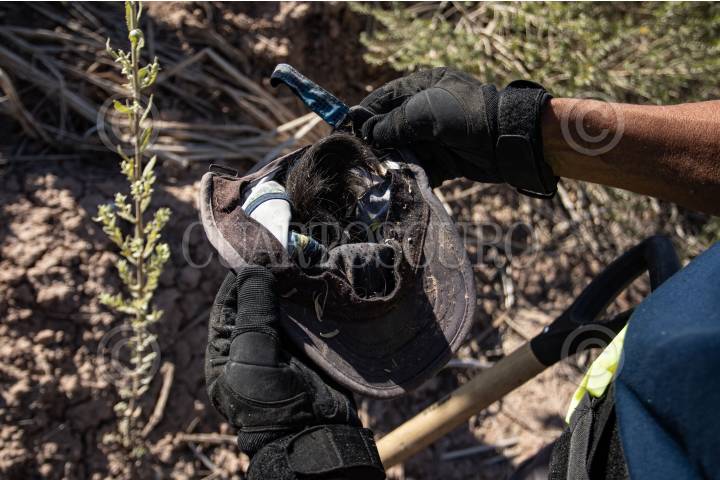 Un presunto indicio de material con marchas es sostenido por una integrante de la Unión de Familias Resilientes durante la brigada de búsqueda en el cerro del Higuerón en Jojutla, Morelos.