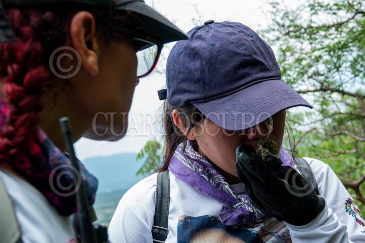 La buscadoras "Lina" y Mónica, integrantes de la Unión de Familias Resilientes, analizan un fragmento durante la brigada de búsqueda en el cerro del Higuerón en Jojutla, Morelos.