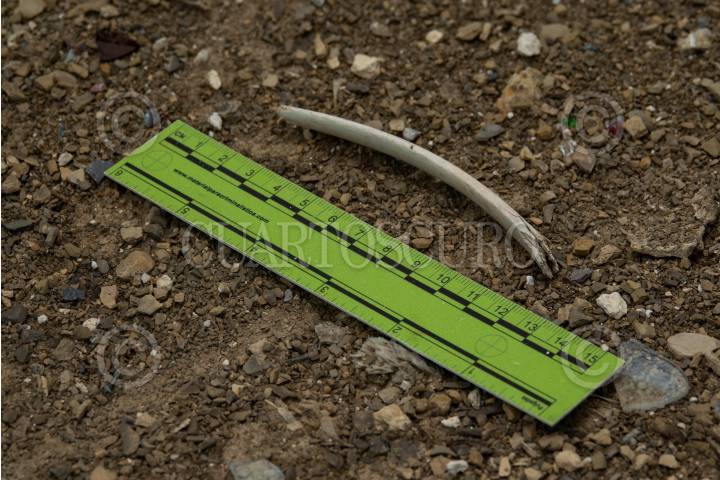 Un presunto hueso es medido y registrado por integrantes de la Unión de Familias Resilientes durante la brigada de búsqueda en los alrededores del basurero de Jojutla, Morelos.