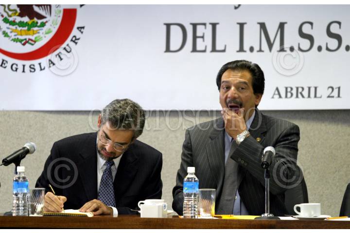 México, D.F. 21 ABRIL 2004.- Santiago Levy, director del IMSS, durante su comparecencia ante el senado de la República. A su lado Elías Miguel Moreno Brisuela, presidente de la Comisión de Salud. FOTO: Sandra Perdomo/CUARTOSCURO.COM