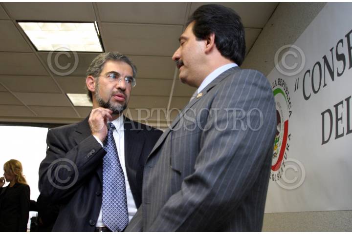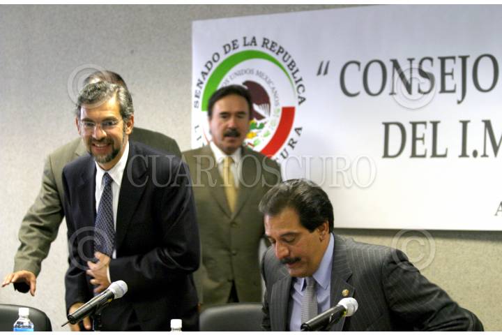 México, D.F. 21 ABRIL 2004.- Santiago Levy, director del IMSS, antes de dar inicio a su comparecencia ante el senado de la República. En la imagen el senador Emilio Gamboa y Elías Miguel Moreno Brisuela, presidente de la Comisión de Salud. FOTO: Sandra Perdomo/CUARTOSCURO.COM