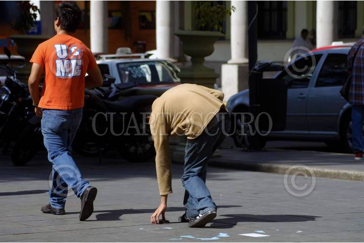 XALAPA, VERACRUZ, 28DICIEMBRE2012.- Para celebrar el “Día de los Santos Inocentes”, boleros del Parque Juárez colocan una cartera con dinero para que la gente caiga en la broma al querer levantar la billetera. FOTO: TONA NAVARRO /CUARTOSCURO.COM