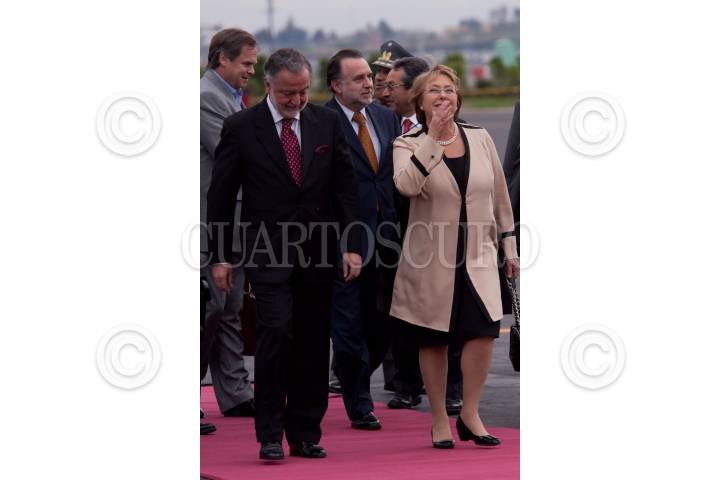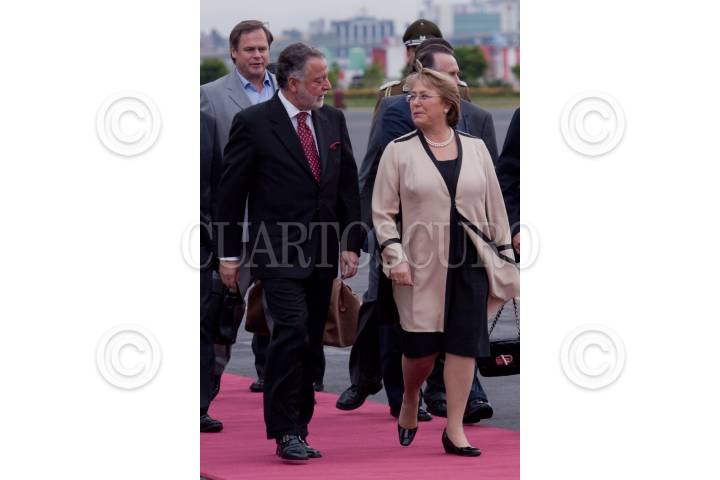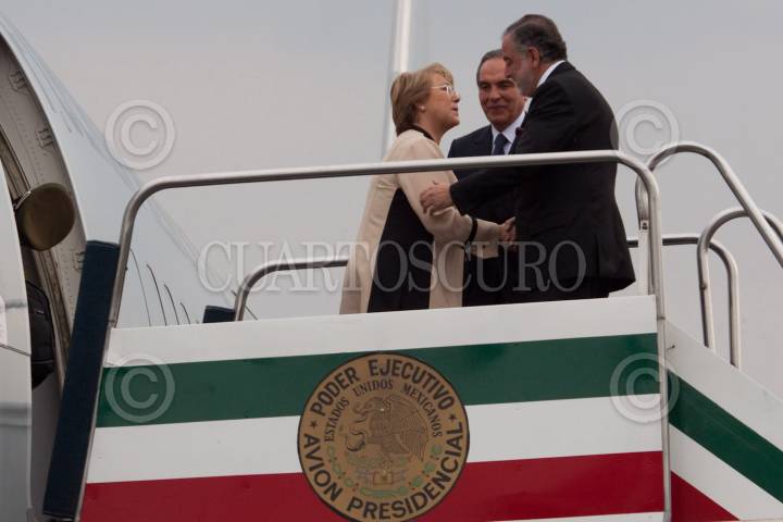 MÉXICO, D.F., 24JUNIO2009.- El embajador de chile en México German Guerrero, recibió en el angar presidencial a la presidenta de Chile, Michelle Bachelet, en lo que supone la primera visita de un mandatario latinoamericano tras el brote del virus AH1N1 FOTO: RICARDO CASTELAN/CUARTOSCURO.COM