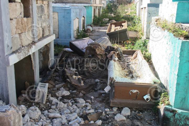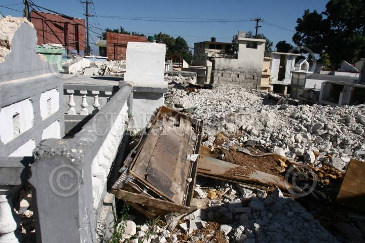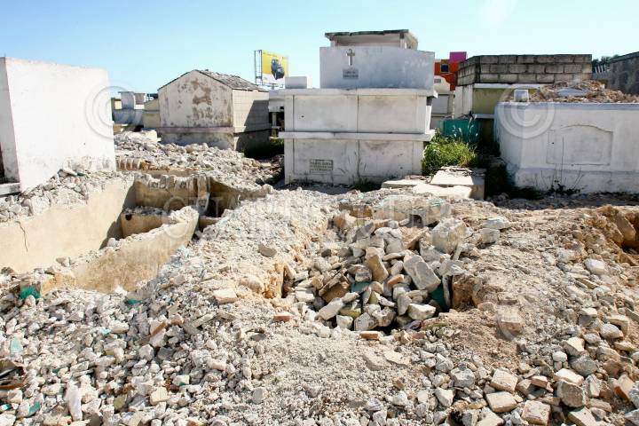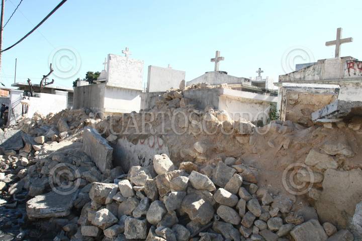 SPETIOÑ VILLE, HAITI., 30ENERO2010.- Diversos panteones de Haiti quedaron derrumbados debido al fuerte terremoto que azoto la nación, los féretros y cadáveres quedaron expuestos. Pobladores de Spetioñ Ville temen un brote de enfermedades debido al olor fétido que yace en calles aledañas al cementerio. FOTO: SAÚL LÓPEZ/CUARTOSCURO.COM