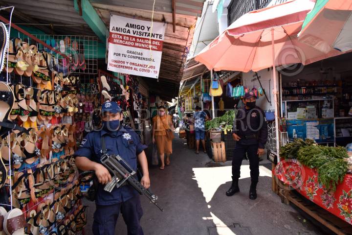 Policías municipales resguardan los accesos del mercado Tierra Caliente, en Juan R. Escudero, Guerrero, tras los reportes de brotes de Covid-19.