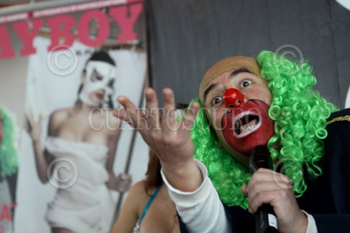 MÉXICO, D.F., 15OCTUBRE2010.- Brozo el payaso tenebroso y su asistente La Reata, presentaron el número de la revista Playboy en el cual salen ilustrando la portada bajo el título "La Reata Bicentenaria de Brozo en boca de todos". La publicación muestra imágenes de la bella asistente representando arquetipos de la historia de México, como Sor Juana Ines de la Curz y la Diana Cazadora. FOTO: MOISÉS PABLO/CUARTOSCURO.COM