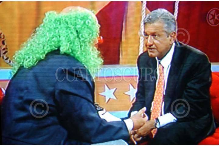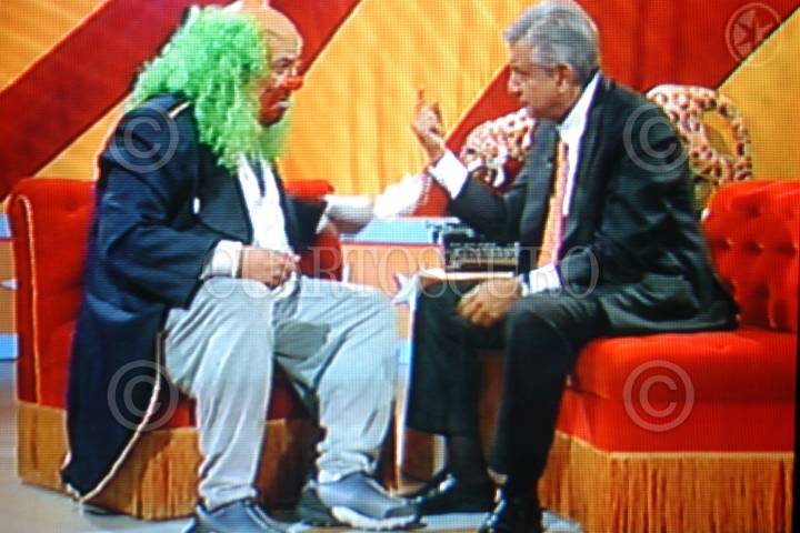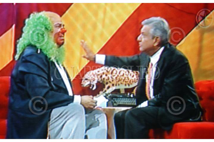 México D.F., a 15 de Mayo de 2006.- Brozo, en su programa nocturno de todos los viernes, tuvo como invitado al aspirante presidencia de la Calición por el Bien de Todos Andrés Manuel López Obrador. El candidato chacoteo y converso con el payaso tenebroso, por mas de una hora, en el programa que se transmite por el canal de las estrellas. FOTO: Tomada de la televisión/CUARTOSCURO.COM