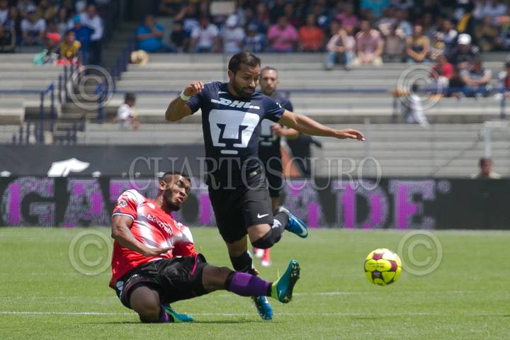 CIUDAD DE MÉXICO, 23ABRIL2017.- El jugador Pumas Bryan Rabello luchando en el medio campo, durante el partido en contra de los Tiburones del Veracruz. Los del puerto se impusieron 2-0, en el Estadio Olímpico. FOTO: MOISÉS PABLO /CUARTOSCURO.COM