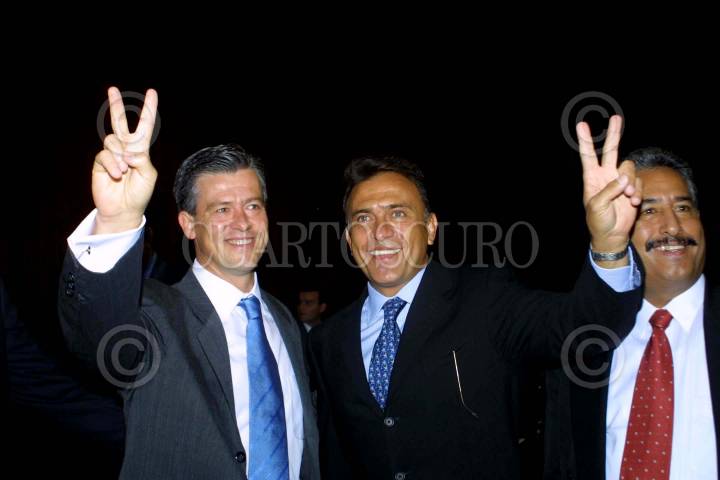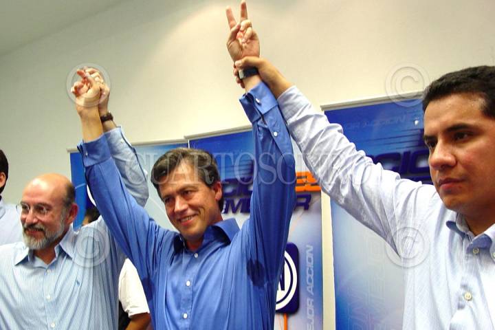 XALAPA, VERACRUZ 05 SEPTIEMBRE 2004 .- El candidato a la gubernatura del estado Gerardo Buganza festeja el triunfo acompañado del dirigente nacional del PAN Luis Felipe Bravo Mena y el dirigente estatal Alejandro Vázquez. FOTO: Carlos Tischler/CUARTOSCURO.COM