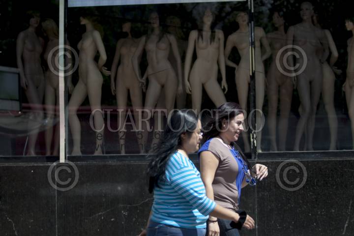 MÉXICO, D.F., 12OCTUBRE2012.- Muchas mujeres viven obsesionadas con alcanzar los actuales cánones estéticos impuestos por las grandes empresas de la moda. Capitalinas pasan frente a una vitrina de maniquís que muestran esta ideal corporal de la extrema delgadez. FOTO: MOISÉS PABLO /CUARTOSCURO.COM