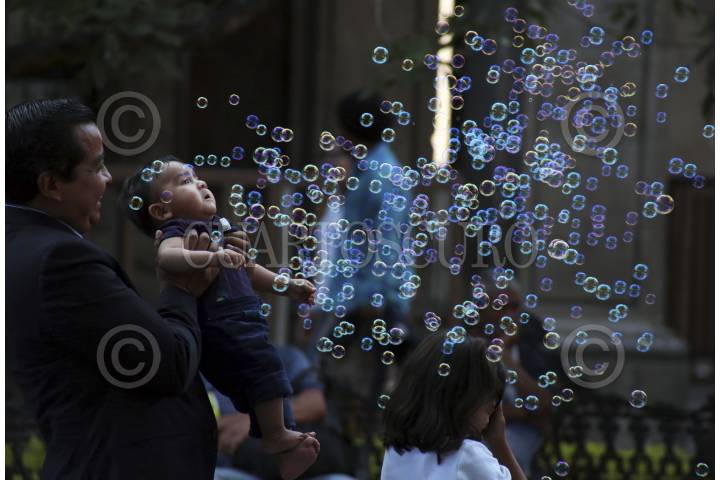 CUERNAVACA, MORELOS, 13FEBRERO2018.- Vida cotidiana de esta tarde en el zócalo de la ciudad, un bebe reacciona con las burbujas que un vendedor lanza. FOTO: MARGARITO PÉREZ RETANA /CUARTOSCURO.COM