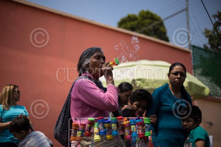 CIUDAD DE MÉXICO 12MAYO2018.- Una mujer vende burbujas durante un evento político en las calles de la colonia Residencia Zacatenco en la delegación Gustavo A. Madero. FOTO: ADOLFO VLADIMIR /CUARTOSCURO.COM