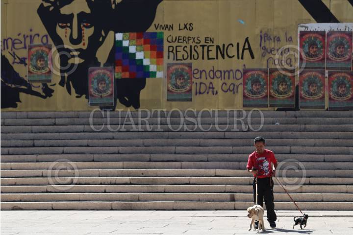 Un señor pasea a sus perros sobre las escalinatas del Ángel de la Independencia.
